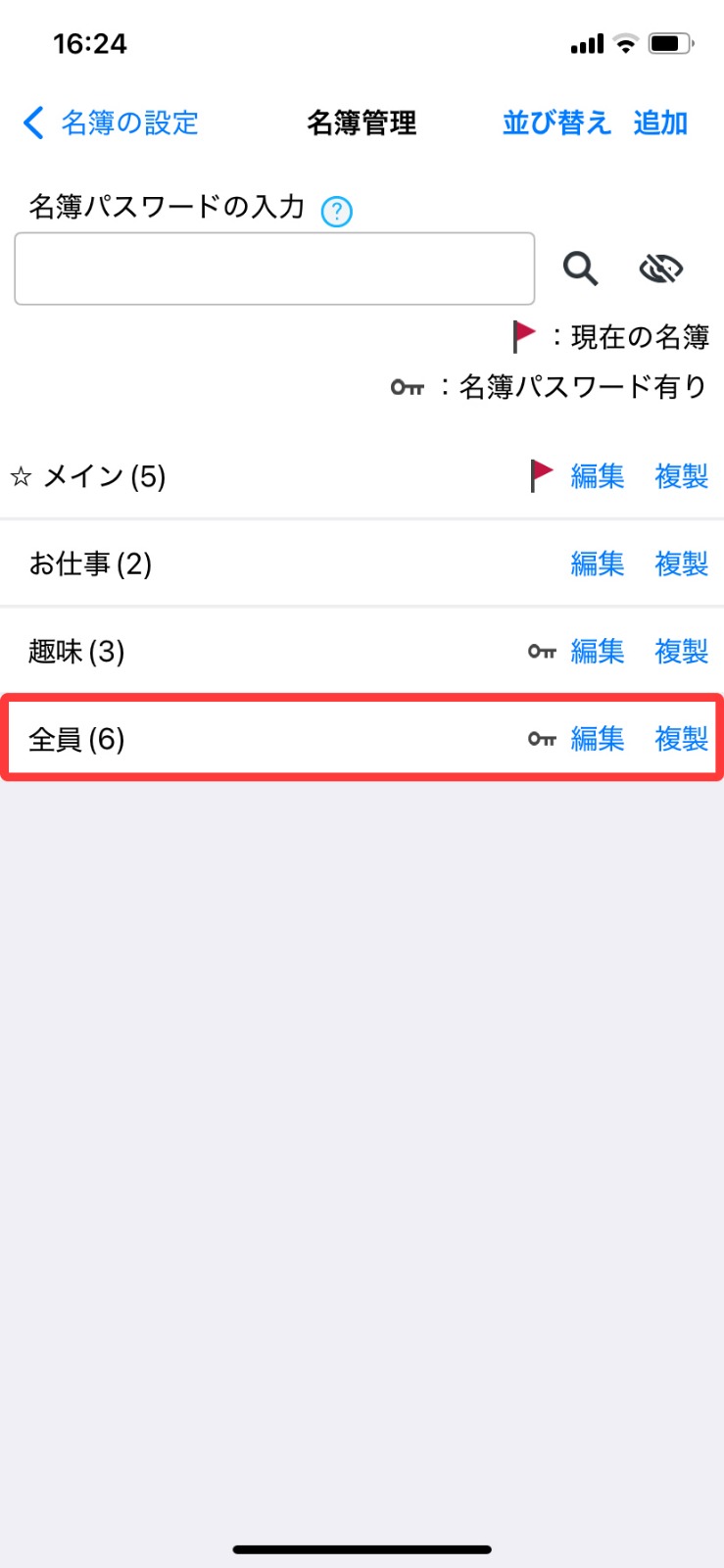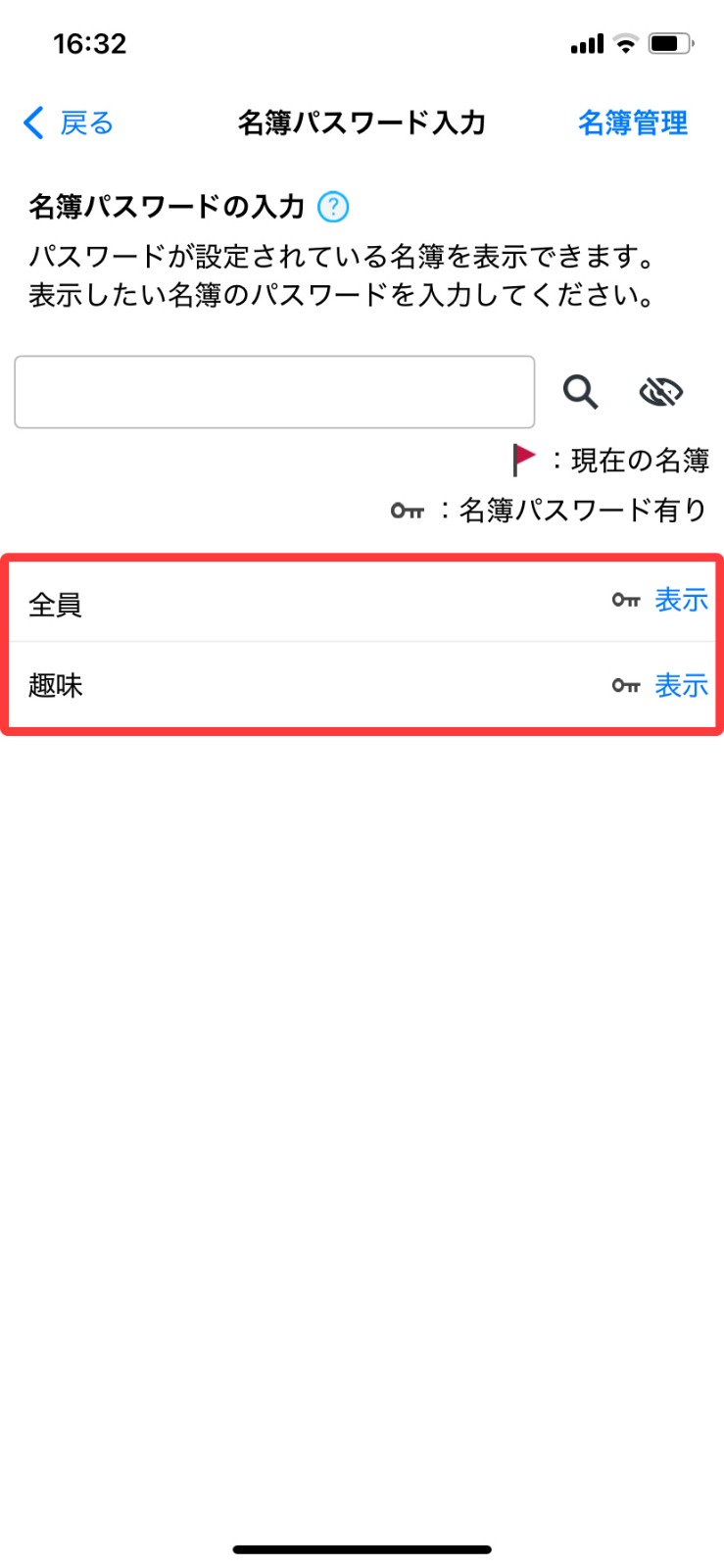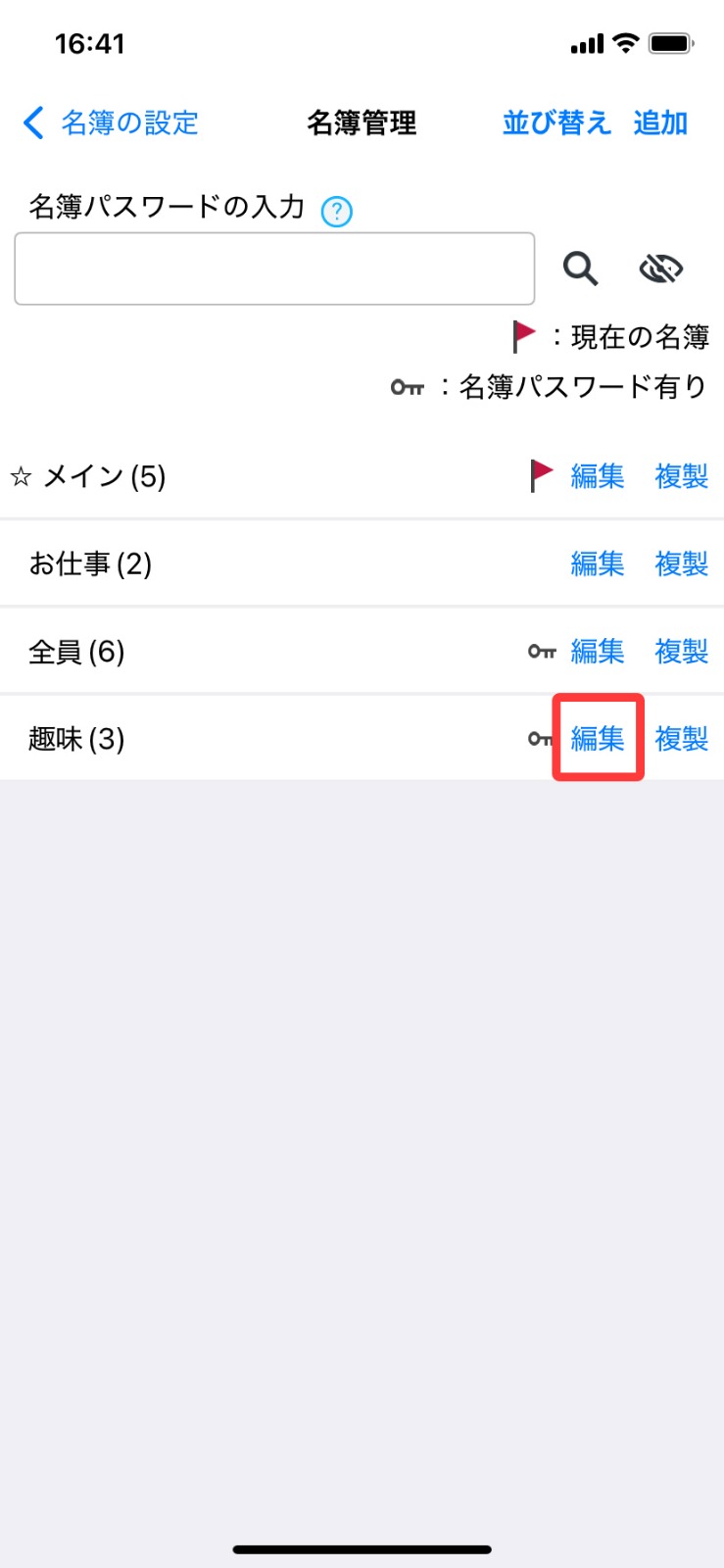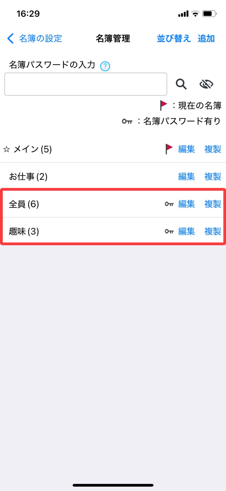パスワードを設定した名簿は、パスワードを入力しなければ表示されません。