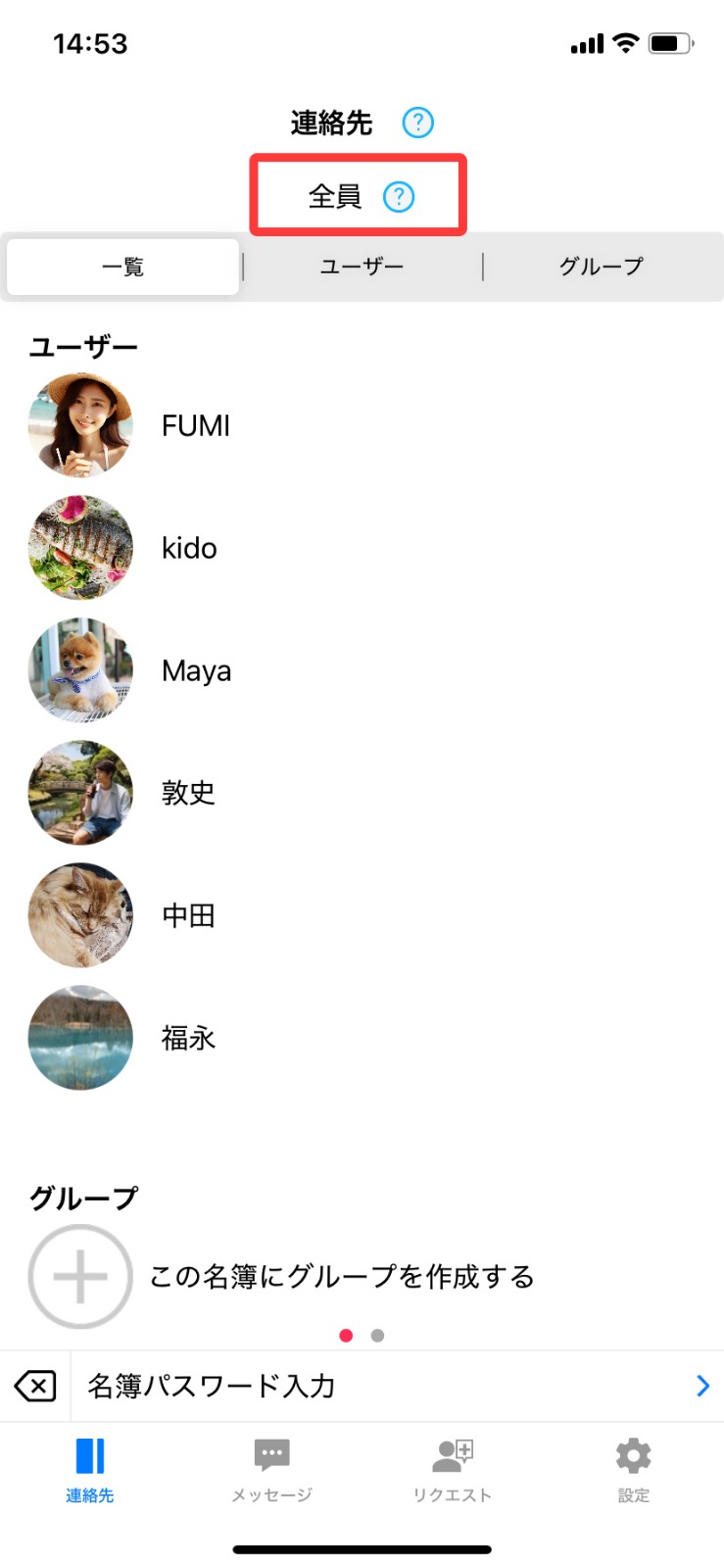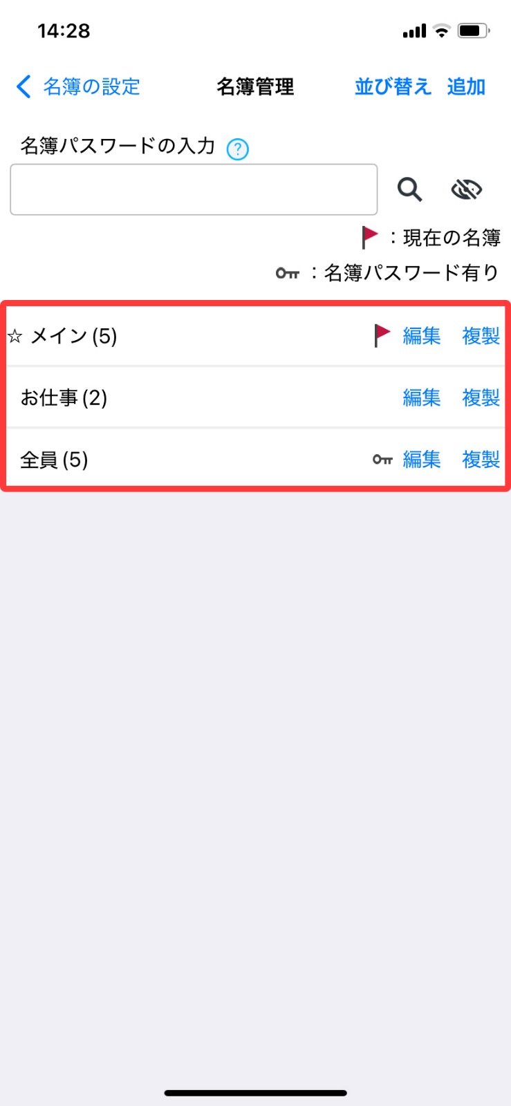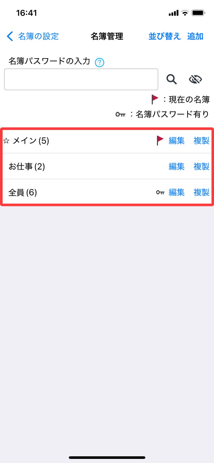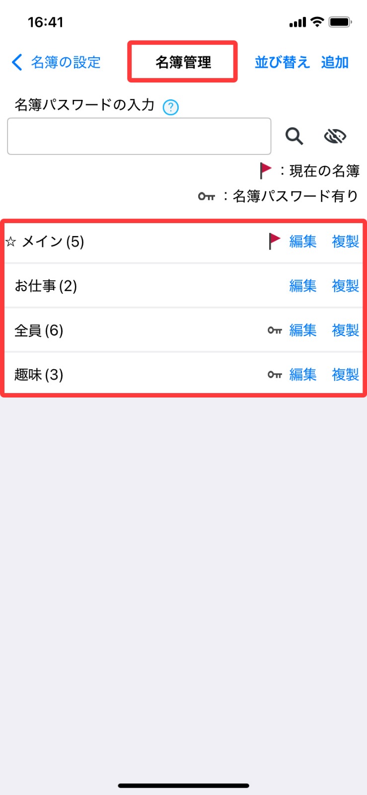 「メインで利用する名簿」や、「仕事関係の名簿」、「全員が載っている名簿」など、複数の名簿を作ることができます。