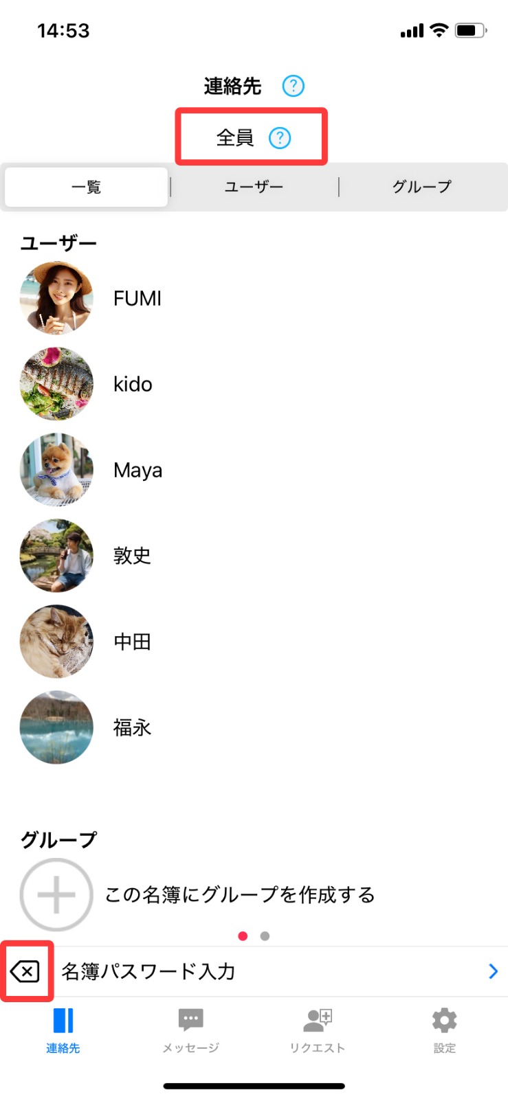 例えば「パスワード有り名簿」にグループを作成して誰も招待せず、自分一人だけのグループにしておくと、そのグループに対して送ったメッセージや写真等は、パスワードを入力して「パスワード有り名簿」を表示しない限り誰にも見られないので、自分一人だけが見れる写真ギャラリーを作ることもできます。