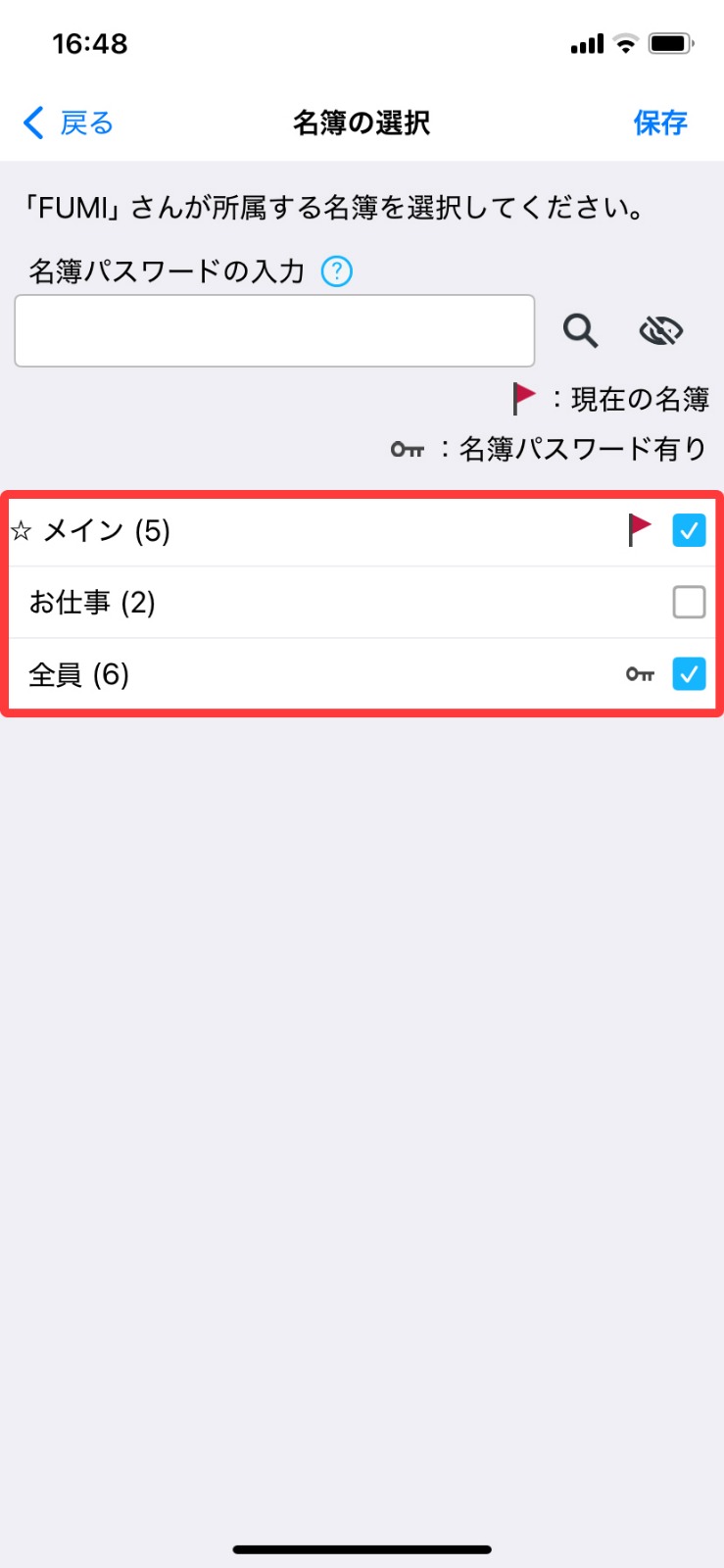 複数の名簿に登録する場合は、登録したい複数の名簿にチェックを入れて「保存」をタップすると、チェックを入れた複数の名簿の「連絡先」に友達が表示されます。