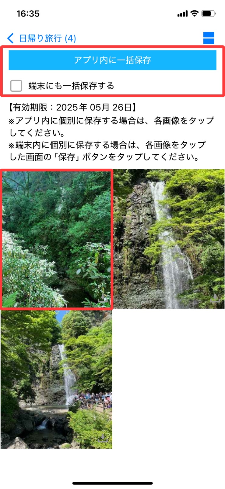 ※有効期限が切れると「アプリ内に一括保存」というボタンが表示されなくなり、アプリ内や端末に保存できなくなります。